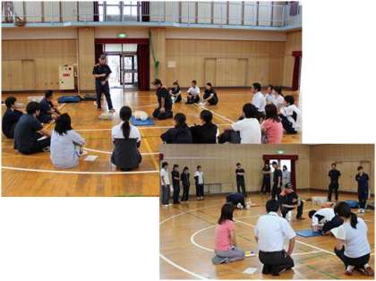 会議室でDVD映像による「心肺蘇生の手順」などの講義を受けて、体育館で「胸骨圧迫・人工呼吸方法」「AEDの使用方法」について実技講習を受けました。