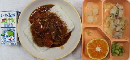 10月5日(水) 給食の献立は、ポークハヤシライス・枝豆・鶏肉とキャベツのソテー・だいこんのピクルス・みかん・米飯・牛乳でした。