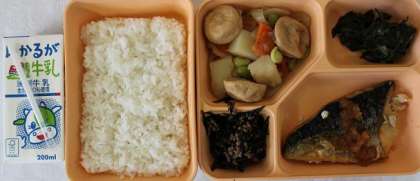 10月18日(火) 給食の献立は、鯖のおろしじょうゆかけ・一口がんもと野菜の煮もの・ほうれん草のおひたし・牛ひじきそぼろ・米飯・牛乳でした。