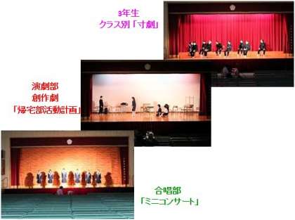 舞台発表の鑑賞は、午前の部が1・2年生、午後の部が3年生になっています。発表内容は同じですが、保護者席のスペースは午前の部は少ないです。できるだけ午後に舞台発表の鑑賞を、午前中に展示見学をお願いいたします。なお、体育館は土足禁止ですので、上履きをご持参ください。