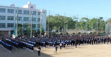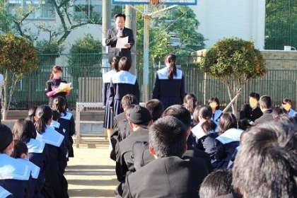 10月24日(月)朝 爽やかな秋空のもと行われた全校集会において、文化発表会展示発表の部「体育大会 学級旗コンテスト」の各学年最優秀賞のクラスが発表され、校長先生から表彰状が授与されるとともに、全校生徒から大きな拍手で祝福を受けました。