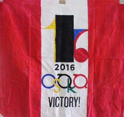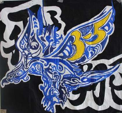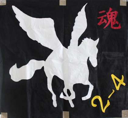 10月24日(月) 朝の全校集会で「文化発表会」≪展示発表の部≫の「体育大会学級旗コンテスト」において、最優秀賞に輝いた各クラスが校長先生から表彰されましたが、その『学級旗』3クラス分を紹介します。