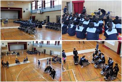 「車いす」体験は、体育館で仕組みや介助する時の注意事項などの講習を受けたり、設定されたコースを二人一組で乗る人、介助する人を体験したり、乗った状態で自走する体験をしました。。「手話」体験は、講師の先生に見本を示していただいて、実際に指文字や手話で自己紹介をしました。「ロービジョン」体験は、アイマスクをかけて介助を受けて教室を歩いたり、ロービジョンメガネをかけて視野を狭くして文字を読む体験をしました。