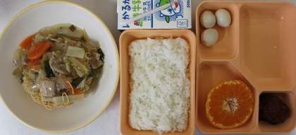 11月14日(月) 給食の献立は、かた焼きそば(揚げめん・うずら卵・野菜あん)、肉だんご、みかん、米飯、牛乳でした。