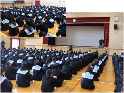 11月17日(木)朝 2年学年集会では、自分自身と向き合うために、全員で1分間眼を閉じて、この一週間を振り返ってみました。