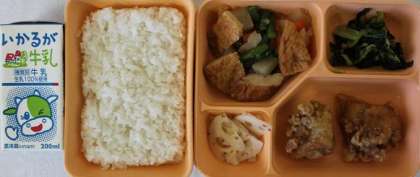 12月6日(火) 給食の献立は、鶏肉のから揚げ・赤平天とだいこんの煮もの・小松菜のおひたし・れんこんの酢のもの・米飯・牛乳でした。