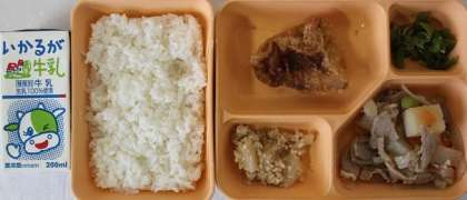 12月8日(木) 給食の献立は、赤魚の竜田揚げ・豚肉と野菜の煮もの・だいこんのそぼろ煮・じゃことピーマンの炒めもの・米飯・牛乳でした。