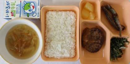 12月9日(金) 給食の献立は、てり焼きハンバーグ・ししゃものから揚げ・水菜のおひたし・りんご缶詰・五目汁・米飯・牛乳でした。