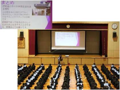 12月12日(月)6限 2年は体育館で、阿倍野区社会福祉協議会、グループホームさくら北畠及び多くのボランティアの方々を講師にお招きして、福祉学習2限目として認知症のある方々が、住み慣れた地域から離れることなく、お互いに助け合って共同生活を送っておられる≪グループホーム≫について学びました。 共同生活の中でできることは自分でする、できないことだけをお互いに助け合うことが大事だということも知ることができました。自分自身がもし認知症になったならば、どんな気持ちになるのかを考えながら、認知症の方と接するときに自分には何ができるかを考えたいと思いました。講師の皆さん ありがとうございました。