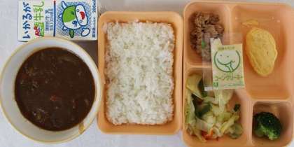 1月13日(金) 給食の献立は、ビーフシチュー・ブロッコリー、オムレツ、ツナサラダ(野菜)、ツナサラダ(ツナ)、米飯、牛乳でした。