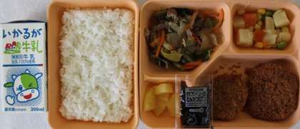 1月17日(火) 給食の献立は、一口ヒレとんかつ・牛肉とチンゲンサイの炒めもの・洋風煮・パインアップル缶詰・米飯・牛乳でした。