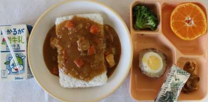 1月18日(水) 給食の献立は、チキンカレーライス・ブロッコリー、スコッチエッグ、福神漬け、みかん、米飯、牛乳でした。