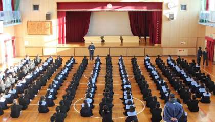 また、先週金曜日に行われた「百人一首大会」の個人成績とクラス対抗の結果が発表されました。個人第1位4組女子、第2位3組男子、第3位1組男子、第4位4組女子、第5位4組女子、第6位3組男子、第7位1組女子と7組女子、第9位5組男子と6組男子の入賞した生徒10名及び、クラス対抗優勝7組、準優勝2組、第3位4組の代表生徒に表彰状が授与され、学年全員から大きな拍手を受けました。