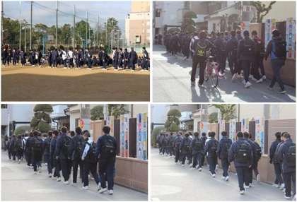 2月8日(水) 晴れわたる青空のもと、1年2年はグラウンドでマラソン大会の開会式を行い、長居公園周回コースに向けて元気に出発しました。途中の長池公園までは徒歩で移動し、ここからはジョギングで移動します。