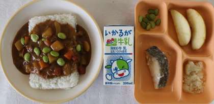 2月8日(水) 給食の献立は、ビーフカレーライス・枝豆、白身魚のムニエル、カリフラワーのピクルス、りんご、米飯、牛乳でした。