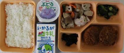 2月9日(木) 給食の献立は、おろしとんかつ・鶏肉と野菜の煮もの・小松菜のおひたし・のりの佃煮・ぶどうゼリー・米飯・牛乳でした。