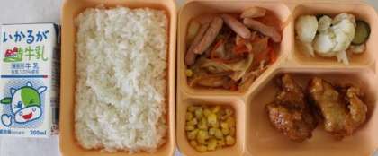 2月14日(火) 給食の献立は、鶏肉のマーマレードソース・ウインナーと野菜のケチャップ煮・カリフラワーときゅうりのドレッシングあえ・コーンソテー・米飯・牛乳でした。