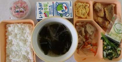 3月3日(金) 給食の献立は、ちらし寿司・錦糸卵・糸よりとちくわのてんぷら・菜の花とコーンのサラダ・三色ゼリー・すまし汁・米飯・牛乳でした。【ちらし寿司は副食の具材と錦糸卵をご飯の上にのせていただきました。】