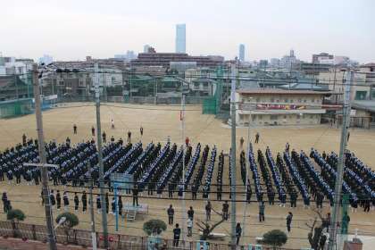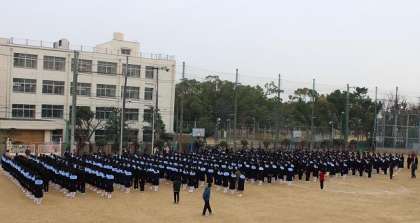 3月6日(月)朝 全学年が揃った最後の≪全校集会≫をグラウンドで行いました。 3年生にとっては、全校集会で聴く「校長先生の講話」も最後となりました。