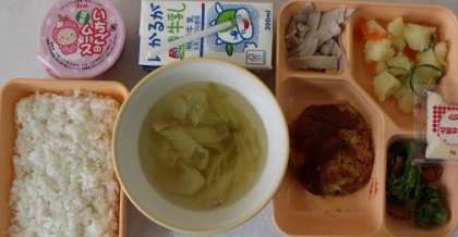 3月6日(月) 給食の献立は、とうふハンバーグ・ポテトサラダ・ハム・ブロッコリーの甘辛あえ・いちごのムース・ベーコンとキャベツのスープ・米飯・牛乳でした。【ポテトサラダにハムを混ぜて、マヨネーズをかけていただきました。】