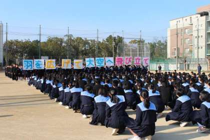 実行委員長のあいさつの後、記念品を手渡して「3月9日(レミオロメン)」の合唱とともにパネルと呼び掛けで「はなむけのエール」を贈りました。3年生代表の「卒業のことば」の後、1・2年生全員で作った花道を3年生が担任の先生を先頭に送り出されました。