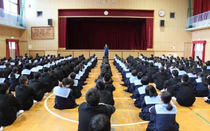 3月9日(木)朝 2年学年集会では、全クラスで取り組んでいるチャイム前に「着席」「授業の準備」「静かにする」について、しっかりと実践できていますか。チャイムとともに≪ONとOFF≫を明確に切り替えて、授業に集中しましょう。また、言葉づかいについても、相手に合わせてしっかりとけじめをつけましょう。という呼びかけを行いました。