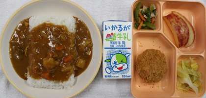 3月15日(水) 給食の献立は、ミンチカツカレーライス・ミンチカツ、ベーコンとピーマンのソテー、キャベツのピクルス、りんご、米飯、牛乳でした。