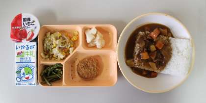 4月12日(水)の給食は、入学・進級祝い献立となっており、カツカレーライス(一口とんかつ)・グリーンアスパラガス・野菜ソテー・カリフラワーのピクルス・いちごゼリー・米飯・牛乳でした。