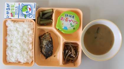 5月1日(月) 給食の献立は、さごしの赤しそ風味焼き、きんぴらごぼう、ふきの煮びたし、お茶プリン、みそ汁、米飯、牛乳でした。