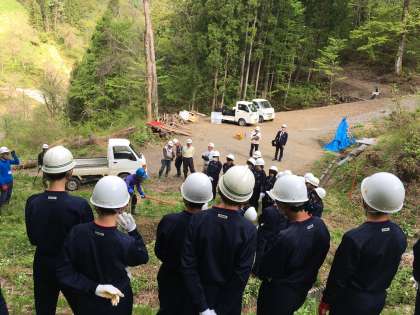 小谷自然学校に到着し、トチノキ植樹体験をしています。