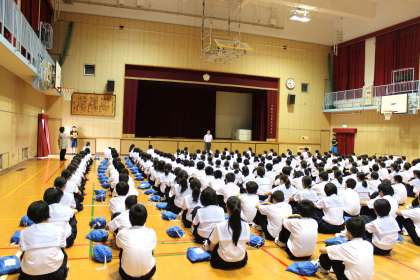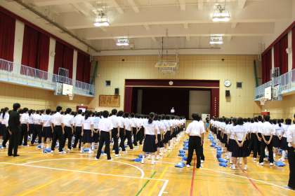 続いて、体育大会に向けて、「校歌」、「阪中健児の歌」の練習を行いました。なかなか大きな声が出なかったのですが、練習を重ねていくうちに徐々に大きな声になってきました!