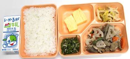 6月6日(火) 給食の献立は、豚肉と根菜の炒め煮、卵焼き、はくさいの煮びたし、じゃことピーマンの炒めもの、米飯、牛乳でした。