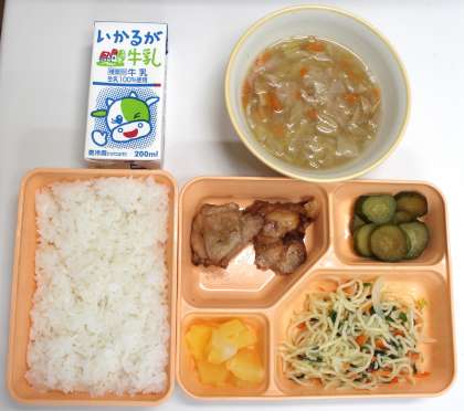 6月12日(月) 給食の献立は、チャンポン(炒めめん・スープ)、鶏肉の中華みそ焼き、きゅうりのピリ辛あえ、パインアップル缶詰、米飯、牛乳でした。
