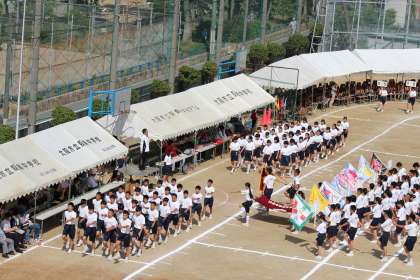 校旗を持つ生徒会長を先頭に入場行進が始まりました。続いて「阪中健児の歌」を斉唱しました。