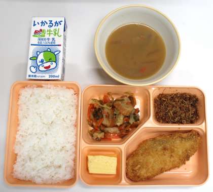 7月3日(月) 給食の献立は、白身魚フライ、ちくわと野菜の炒めもの、かつおぶしとじゃこのいり煮、卵焼き、豚汁、焼きのり、米飯、牛乳でした。