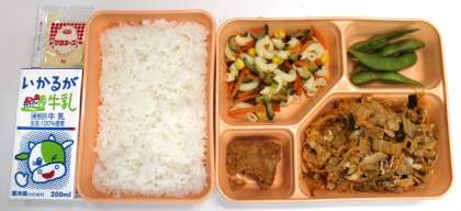 7月4日(火) 給食の献立は、豚キムチ、マカロニサラダ、枝豆、鶏肉のから揚げ、米飯、牛乳でした。