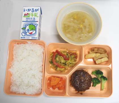 7月5日(水) 給食の献立は、チーズインハンバーグ、ボイルブロッコリー、鶏肉と野菜のカレーソテー、フライドポテト、にんじんのグラッセ、スープ、米飯、牛乳でした。