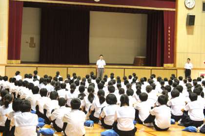 集会では、帽子の販売についての説明がありました。また、今日は「ノーチャイムデー」です。みんなで助け合い、優しい声かけをしましょう!とお話がありました。