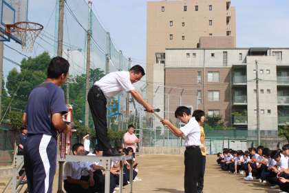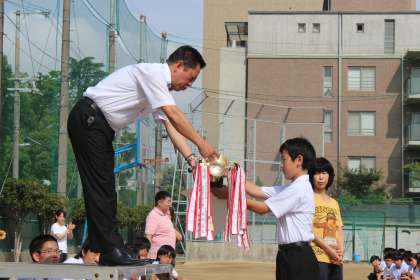 7月10日(月)朝、全校集会において、土曜日に開催された大阪市春季総合体育大会(卓球の部 個人戦)で優勝したSさんの賞状伝達が行われました。校長先生から表彰状と優勝カップが授与され、全校生徒からの祝福の拍手を受けました。