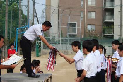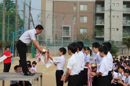 「大阪中学校優勝卓球大会」において、男子団体の部で優勝、個人の部で2年男子が優勝の栄冠に輝き、同じく2年男子が第3位に入賞しました。「近畿中学校総合体育大会」に出場して、男子団体の部で準優勝、個人の部で2年男子が準優勝に輝きました。「全国中学校卓球大会(鹿児島県開催)」に出場して、男子団体の部 ベスト13となり優秀校に選ばれました。校長先生から表彰状、優勝旗、優勝カップが伝達授与され、全校生徒から大きな拍手で祝福されました。よくがんばりました!おめでとう!