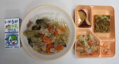 9月4日(月) 給食の献立は、中華丼・えび、にらたま、春雨サラダ、ふかしいも、米飯、牛乳でした。