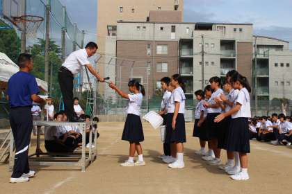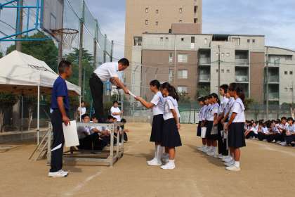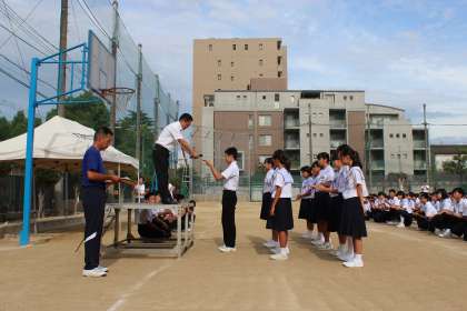 9月11日(月)朝、「大阪中学校水泳競技大会」で男子個人100m背泳ぎ第2位、200m背泳ぎ第2位に入賞した3年男子生徒に、「大阪市ブロック大会」で女子バスケットボール部が第2位となり、また個人優秀選手に選ばれた3年女子に、女子テニス部が「大阪秋季総合体育大会ブロック大会予選」団体で第3位に、「新人戦ブロック大会」個人で第3位に、「ブロック大会」団体で第3位に、2・3年生の部で第5位に入賞した女子テニス部の代表生徒に校長先生から表彰状が伝達授与され、全校生徒から大きな祝福の拍手を受けました。