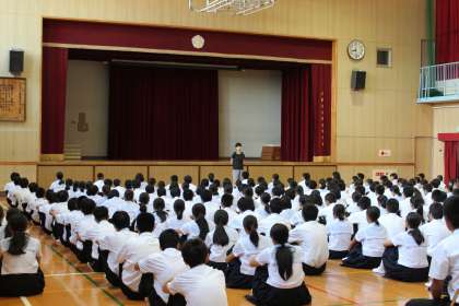 集会では、南野先生から 今朝の服装チェックで「ルールを守っていない人」がいます。どうしてミスをしてしまったのでしょうか。「うっかりした」「疲れていた」「慌てていた」のでしょうか。ミスは、細心の注意を払えば防げます。自分を戒め、気合を入れてミスしないようがんばってくださいと、お話がありました。