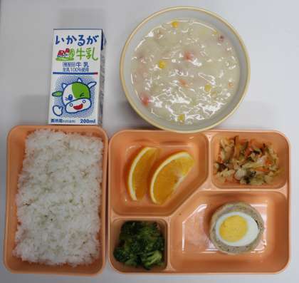 9月15日(金) 給食の献立は、クリームシチュー・ブロッコリー、スコッチエッグ、キャベツのドレッシングあえ、オレンジ、米飯、牛乳でした。