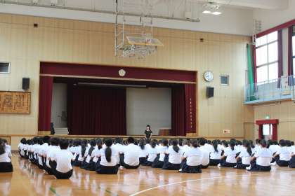 集会では、南野先生から「カレーハウスCoCo壱番屋」創業者 宗次徳ニさんのプロフィールを紹介しながら、誰しも失敗することはある。失敗したときは、素直に認めて、失敗を繰り返さないことが大切です。これからの人生いろんなことあると思いますが、がんばってほしいと、「七転八起」のお話がありました。