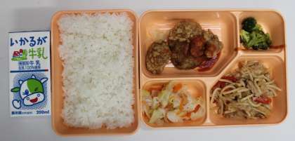 9月28日(木) 給食の献立は、豚肉のオーロラソース、ツナスパゲッティ、キャベツとにんじんのサラダ、ブロッコリーのドレッシングあえ、米飯、牛乳でした。