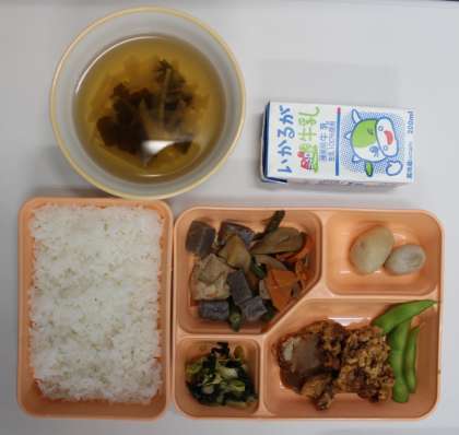 10月4日(水) 給食の献立は、豚肉のみそだれかけ、枝豆、筑前煮、さといもの煮もの、小松菜とはくさいのおひたし、すまし汁、米飯、牛乳でした。