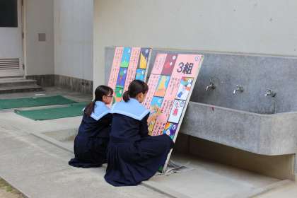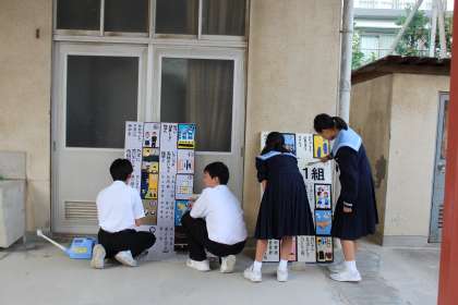 「創作カルタ」がいよいよ完成に近づいてきました。今日は、カルタの釘打ちとニス仕上げを行いました。クラスごとにテーマを決め「創作カルタ」に一人一人の思いを乗せて・・・!