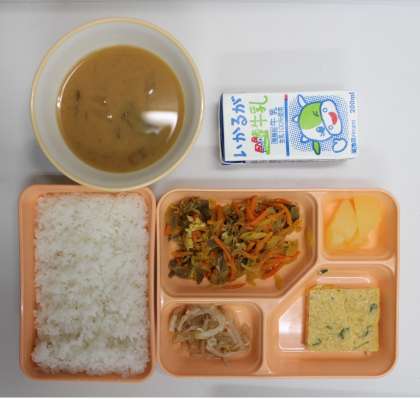 10月6日(月) 給食の献立は、牛肉の和風カレー炒め、千草焼き、もやしのあえもの、りんご缶詰、みそ汁、米飯、牛乳でした。