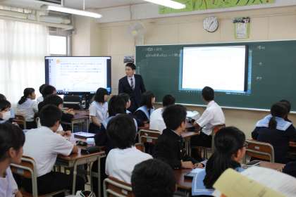 研究主題を「数学的に考える力を育む授業の創造」とし、「問題解決学習」「協動的な学習」「ICT活用学習」をテーマに、2年1組、4組、7組で公開授業が行われました。